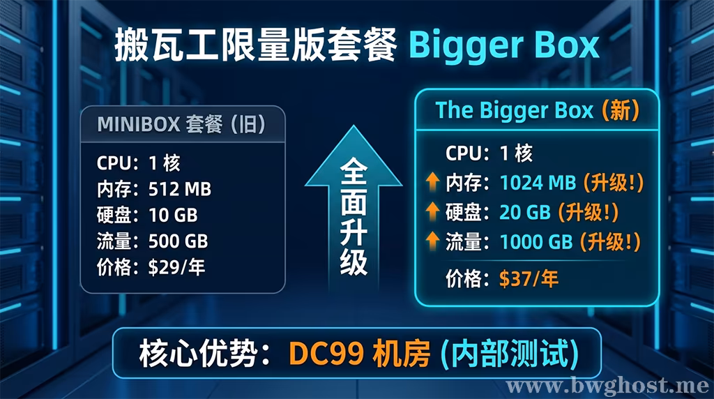 搬瓦工 Bigger Box 与 MINIBOX 限量版套餐核心配置升级对比
